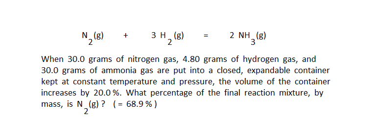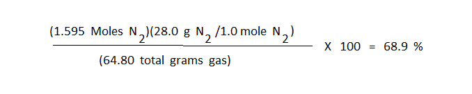 The final required answer is calculated by computing the final moles of N2, converting that value to grams N2, then giving the percentage obtained by dividing grams of N2(g) by 64.80 total grams of gas.